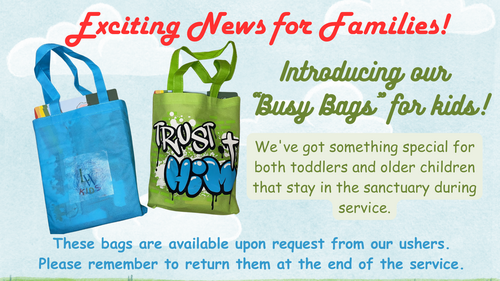 If you have any questions or need a Busy Bag for your child, please don't hesitate to ask one of our ushers. We look forward to seeing you at our services with these new additions to our church family.