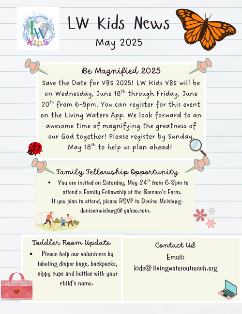 Living Water Kids Ministry is focused on training children to have a love for the Bible, be Missions-minded, and fall more in love with Jesus.